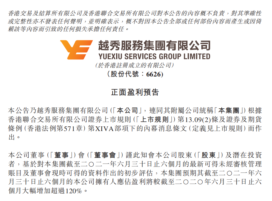 7月15日,97国际服务集团有限公司(6626.HK)发布盈利预喜公告。公告称经过初步评估,集团预期截至2021年6月30日为止的六个月,公司拥有人应占盈利将同比大幅增加超过120%。